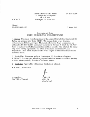 This manual provides guidance for the design of Hydraulic Steel Structures (HSS) by Load and Resistance Factor Design (LRFD). This includes design of new structures, replacement, rehabilitation, and repair. Mechanical and electrical design guidance are addressed in EM 1110-2-2610. Guideline commentary is provided in Appendix B. This manual supersedes ETL 1110-2-584 (USACE, 2014) and EM 1110-2-2702 (USACE, 2000).