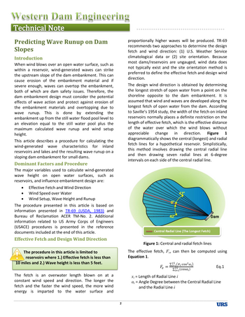 Wave runup is defined as the vertical distance that waves travel up the embankment slope above the storm water level. The runup height depends on wave characteristics, embankment slope, and surface roughness. The article provides equations for estimating wave runup on riprap-protected slopes and emphasizes that steeper slopes generally result in higher runup. The sum of wind setup and wave runup determines the required vertical extent of freeboard above the still water flood pool elevation.